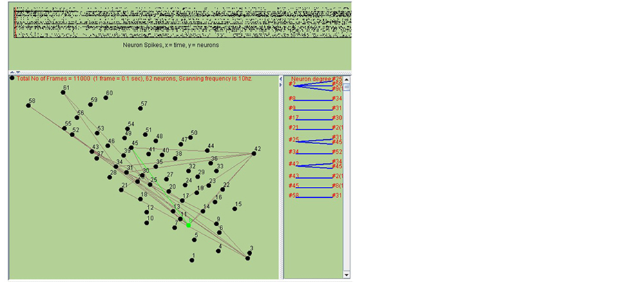 Based on the proposed two different strategies, two neurons that may share a connection might be connected from tens to hundreds of times. Each time of connection is with the same unit strength. However, more times of connection between neurons indicate the higher probability for the existence of synapse. As shown in Figure 3, the network is rebuilt by combination of two methods. The upper panel in Figure 3 shows the spikes states of 62