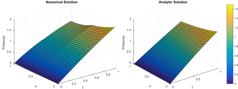 In this section, we present the numerical solution of the single-phase flow model given in Equation (1) using the solution (Equation (38)) from Chebyshev wavelet collocation method discussed above and compare with the exact solution given in Equation (39) below: