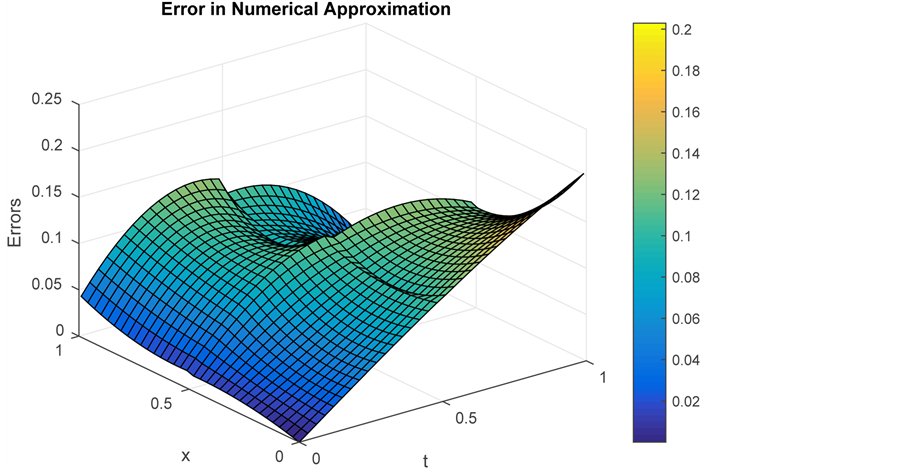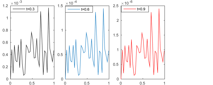 Figure 3. Absolute error in Chebyshev wavelets approximation of pressure in the medium for single-phase flow.