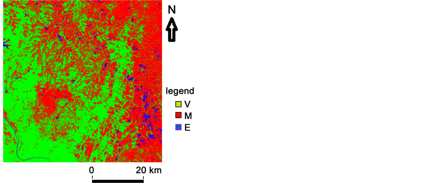 This information was modeled by mass functions based on a model of normal law and simple support (two focal elements: the discernment framework and the potential grouping of the pixel to be classified). This produces a segmented image in six classes, including three absolute classes (E,V,M) and three classes of confusion ({E,V}, {M,V}, {E,M}). The field verification, based on geographical coordinates of pixels of the said classes, made it possible to make a concordant interpretation thereof.