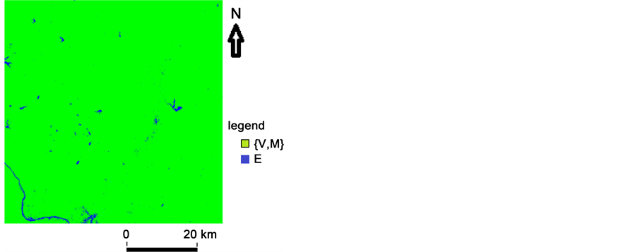 {E,M} is the area of yellowish color marking the confusion between water and mineral surfaces. It covers 1.541% of the area observed (5970.604 km2) and marks the places (where the vegetation is almost non-existent) with presence of water. This corresponds to places with abundant water and minerals (flats of water courses and bodies, water-saturated soils, very humid soils, etc.).