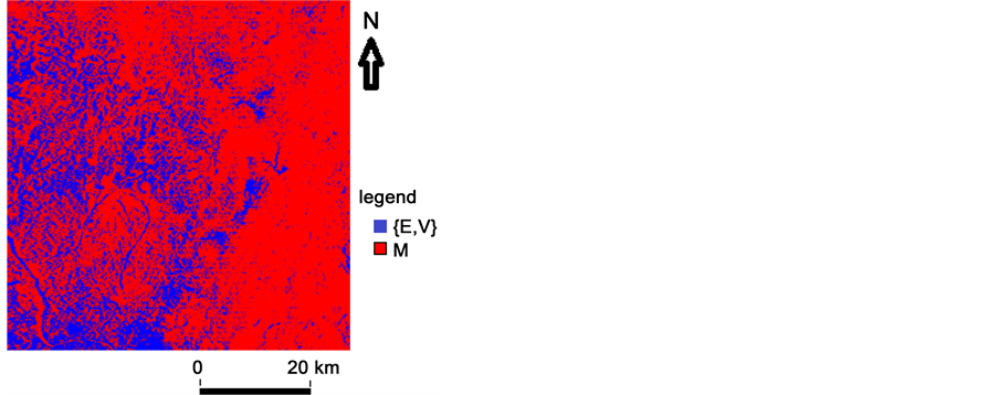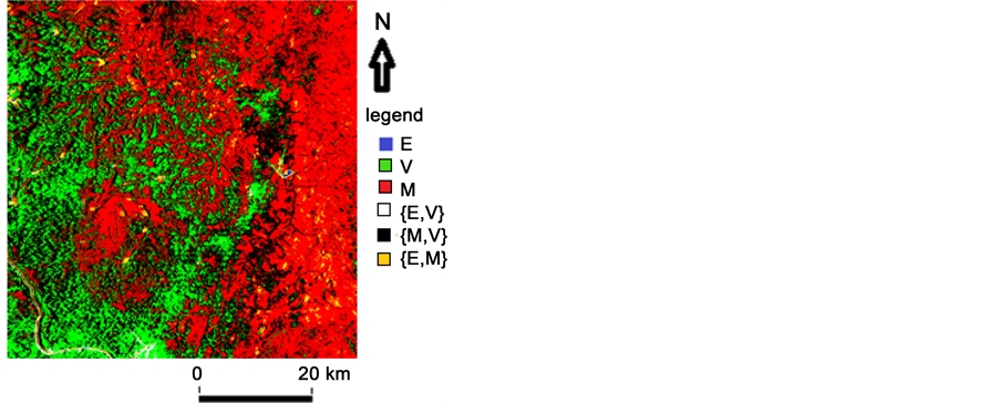 The analysis of Figure 8 shows an image classified into three absolute classes (E,V,M) and three classes of confusion ({E,V}, {M,V}, {E,M}).