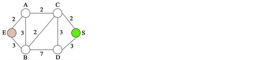 In Figure 3, nodes represent cities identified by a letter and numbers on edges indicate the distances. We seek the shortest road connecting the cities E and S. Table 1 provides the shortest path from E to S with 6 as weight. It is composed by E-A-C-S.