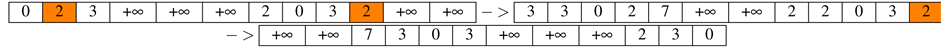Table 3. At the end of the algorithm, we have G’ as graph result (a) containing the shortest paths, weights D’ (b), node’s status M’ (c) and predecessor’s vector P’ (d) which is used to construct final solution.