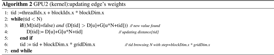The prior Dijkstra’s algorithm used is based on adjacency matrix. It was modified to take under consideration the data structure and platforms. On both platforms codes were written in c++ with Nvidia’s CUDA language extensions for the GPU.