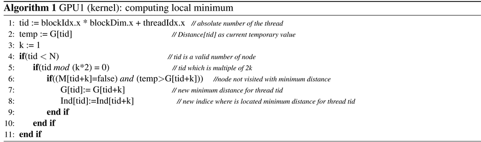 The first inner loop selects among all the adjacents vertices not marked, the one with the minimum weight. At this step, the set of vertices to be processed is divided into groups. Each group is processed by a computer unit (block). When calculations are finished, each unit returns its relative minimum vertex. At last the global minimum is selected.