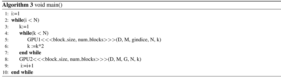 Before launching a kernel4, we must define the grid on which it will be executed [21] [22] . A grid is a set of blocks arranged in one, two or three dimensions. A block is a multiprocessing unit (cores). One must specify the number of threads contained in a block and the number of blocks constituting the grid. GridDim variable is used to set the number of blocks. Block can be arranged in one, two or three dimensions. The variable blockIdx.x component indicates the first size, blockIdx.y provides the second dimension and blockIdx.z returns the third dimension. Each block has an identifier representing its number, ranging from 0 to gridDim.x-1.