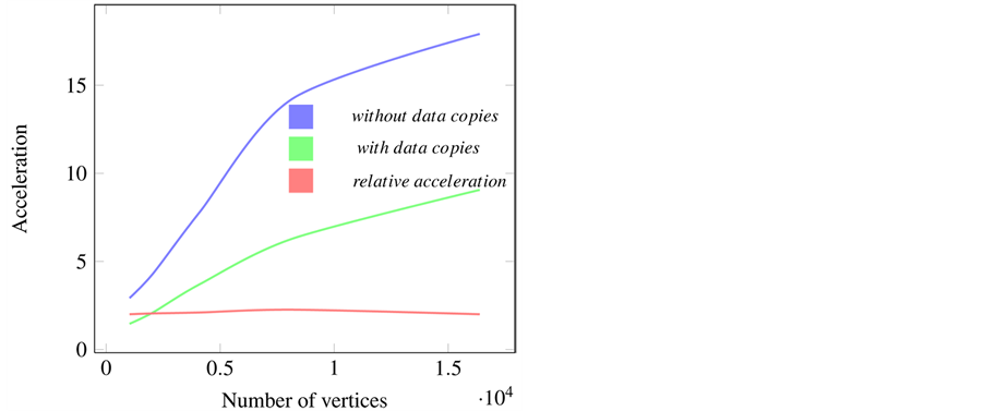 Figure 7 and Figure 8 show the time’s variation of the experiment results. In Figure 9 and Figure 10, accelerations of the two implementations on the two platforms are presented. On these figures plots in red color show the relative acceleration obtained between with-copy version and zero-copy version.