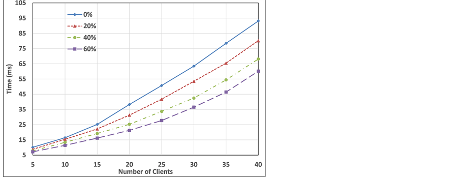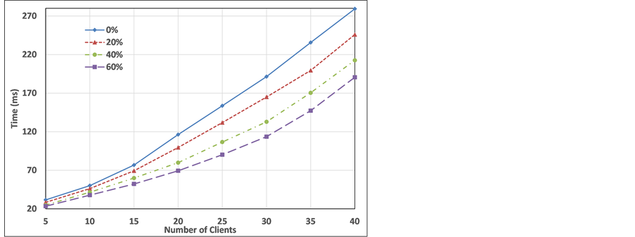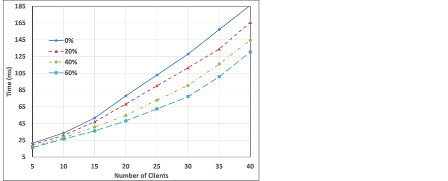 In the first experiment, the number of clients (N) that try to access the local area network at the same instant is increased from 5 to 40 clients. In addition, it is supposed that the network is under attacks and the number of attackers is t percent of all nodes, where t is set to 0%, 20%, 40%, and 60%. The attacker impersonates the identity of the legitimate user and tries to deceive the server to get an offer. In this experiment, the metrics CAT, MAT, and CT are measured and the results are shown in Figures 4-6, respectively.