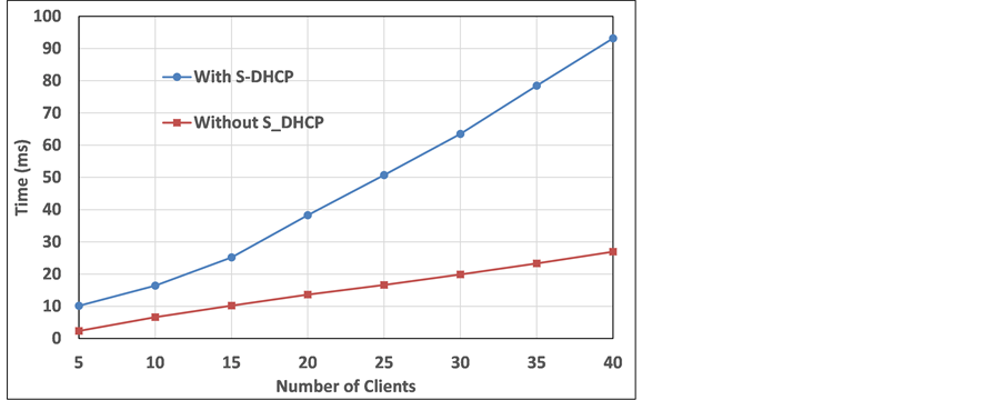 To measure the overhead of using the proposed scheme (S-DHCP), MAT is measured in the case of using S-DHCP and standard protocol (DHCP). As the first experiment, N is varied between 5 and 40, where there are no attackers in the network. Figure 7 shows the results of this experiment. As shown in the figure, the overhead increased from 7.8 ms to 66.2 ms with increasing N from 5 to 40. Although the proposed scheme makes delay in the process of accessing the network by this overhead, it makes the network more secure by mitigating many attacks, as explained in Section 7. In addition, it is clear that overhead is very small.