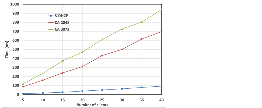 Figure 8 compares between the proposed work and the work introduced in [12] , which uses the digital certificates to authenticate the DHCP messages. For different number of nodes, the authentication time is measured, where the length of the key used to encrypt the digital certificate is 2048 and 3072 bits. As shown in Figure 8, the authentication time in the case of using digital certificate is much higher than that in the case of using the proposed scheme especially with a large number of clients.