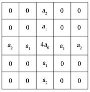 Using fractional calculus to process images, one of the key is the design of fractional calculus mask operator. Commonly, the size of fractional differential mask is (2n + 1) × (2n + 1), n is a positive integer, and Tiansi operator [9] is one of classical fractional differential masks, as shown in Figure 3. The non-zero elements of Tiansi operator are determined by the coefficients of fractional differential expression, which is defined as follow [10] :