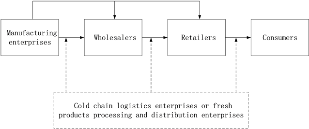 The operation mode of cold chain logistics for fresh agricultural products is shown in Figure 1. Fresh agricultural products through wholesale and retail enterprises to reach consumers after output by production enterprises, and cold chain logistics business or fresh products processing enterprises may participate in all links. Different fresh agricultural products circulation patterns determine the cold chain link number, and development level of different subject-driven circulation pattern differs, so we need to depend on the product quality orientation to decide whether to take measure of the cold chain.