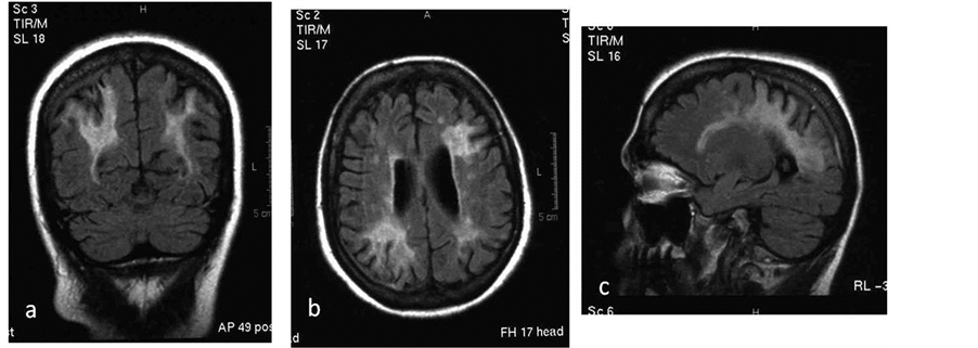 Figure 1. (a) Coronal, (b) axial and (c) Sagital FLAIR sequences. MRI shows symmetrical extensive hyperintensity lesions in the periventricular, deep and subcortical white matter, also involving the splenium. Brain atrophy is incompatible with the patient’s age.
