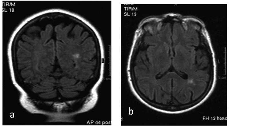 Figure 2. (a) Coronal, (b) axial FLAIR sequences show small lesions adjacent to the left occipital horn.