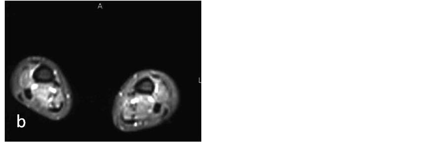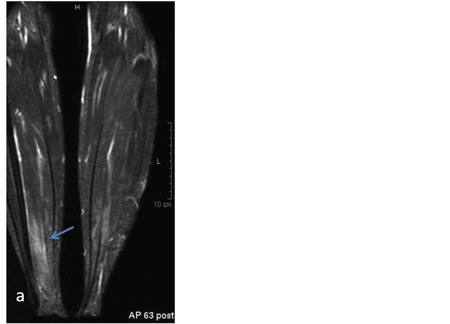 Figure 3. (a) Sagital, (b) axial MR Fat-Saturation images show (a) diffuse hyperintensity within the tibial muscles (arrow) with mild post contrast enhancement (b), findings consisted with myositis.