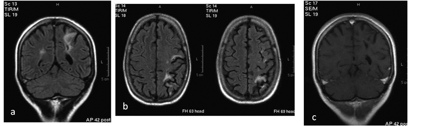 Figure 4. Same patient with Figure 3. (a) Coronal FLAIR sequence shows a porencephalic lesion with peripheral gliosis on the left frontal lobe without contrast enhancement (c). (b) Axial FLAIR sequence shows hyperintensity lesions in the subcortical matter of the left hemisphere.