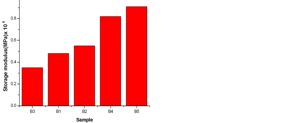 the storage modulus is enhanced for sample B4 and sample B5. However the interfacial adhesion is poor for sample B1 and sample B2 and thus the modulus is very low.