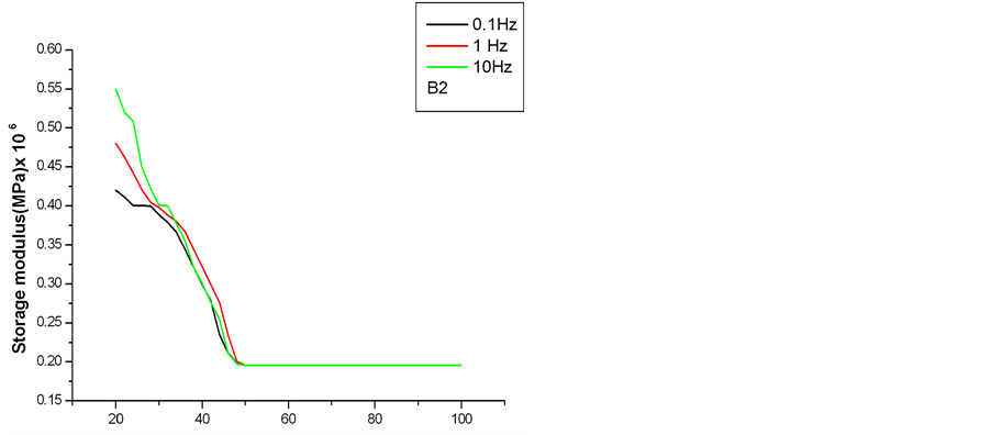 The variation of storage modulus with temperature at different frequencies for the sample B2 is given in Figure 3.
