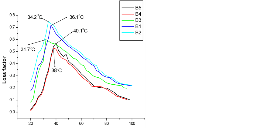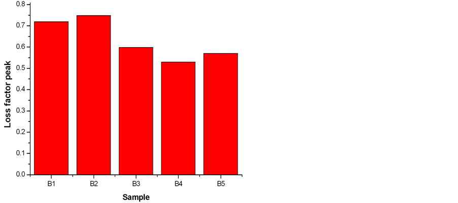 Composites were synthesized by taking RF resin and both chemically treated and untreated LC fibers. The prepared grounded RF resin and LC were mixed in different wt proportion. In sample B1 and B2, the matrix and untreated LC fiber are in wt ratio 1:1 and 1:2 respectively. In sample B4 and B5, the matrix and treated LC fiber are in wt ratio 10:1 and 5:1 respectively. B3 sample contains only powdered RF matrix. Maleic anhydride (1 g) and ethylene di-amine (4.6 ml) were added as cross linkers to 1 g of RF resin. The mixture was heated at constant temperature of around 70˚C for 9 h to get composites. After cooling the composite was washed with distilled water, followed by washing in ethyl alcohol to remove monomers present in it. The grounded composite was then exposed to ultrasonic vibration at 30 kHz for 1 h at room temperature using a sonicator (1.5 L50 H/Deluxe, India). Sonication was responsible to enhance dissolution of particles by breaking intermolecular interactions. The particles of the samples are agitated when exposed to ultrasonic wave and hence particle size decreases. 10 g of powdered composites was then mixed with 10 g of commercial divinyl benzene and kept for 12 h at room temperature of 28˚C. The material was made acidic by addition of 0.25 ml of methane sulphonic acid. The sample was swollen as it absorbed sufficient divinyl benzene in to it. This facilitates the sample to be softened and a paste like material was obtained. This material can easily be shaped and moulded by using mould of different dimensions. The paste was kept in a small mould (10 cm × 2 cm). The mould was heated for 4 h at 60˚C and was cured to get cross linked composite. The dynamic mechanical thermal analysis was conducted using rectangular test specimens having a dimension of 35 mm × 5 mm × 2 mm under 3 point flexural mode using a TA Instruments, USA. The ends of the specimens are freely supported and a load is applied at the middle point. A motor was attached to apply an oscillatory deformation to the specimen. Maximum strain amplitude was set at 0.2%. The specimen was heated at the rate of 3˚C/min under nitrogen atmosphere. The experiment was conducted at three different frequencies 0.1 Hz, 1 Hz, 10 Hz in the temperature range of 30˚C to 100˚C. The variation of storage modulus and loss factor were recorded with variation in temperature and frequency.