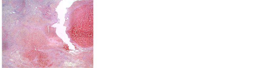 Figure 6. Histopathologic features of a SCD case caused by Coronary Heart Disease. (a) View of coronary artery atherosclerosis complicated by an occlusive thrombus [H/E 40×]; (b) Left ventricle section showing Acute Myocardial Infarction [H/E 400×], complicated by partial wall rupture in (c) [H/E 40×] (source: INMLCF, I.P.).