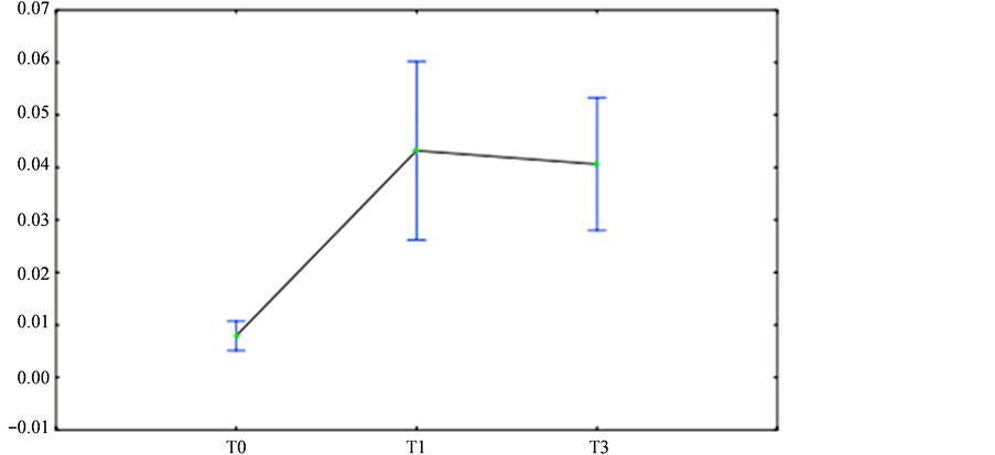 At T0, the values obtained for NT-proBNP showed an average value of 40, 8 ± 9 pg/ml. The reference values established in our laboratory are 5 - 103 pg/ml for the age range that we analysed. The values obtained from our subjects were thus inside the normal range, but we noted an increase with time. Some subjects were above the upper reference value at T1 (average value at T1: 80.6 ± 16 pg/ml). The intense exercise produced during the race induced a significant variation of NT-proBNP. We observed the same kinetic as for HsTnT. We noticed statistically significant variation between T0 and T1 (p = 0.0037) and between T0 and T3 (p = 0.0432) (Figure 2). The last parameter showing a significant variation in time was homocystein, with an increase between T0 and