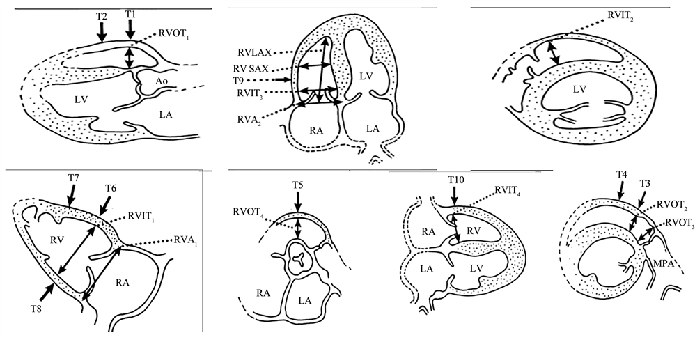 Echocardiographic examinations were performed by a single operator on a GE Vivid 7 ultrasound system. All measurements were performed according to the recommendations of the American Society of Ultrasound [7] . Several cuts were used: left parasternal long axis view, short axis, apical four chambers, two cavities and subcostal incidence. Seven cavity measurements of the right ventricle were performed (Figure 1).