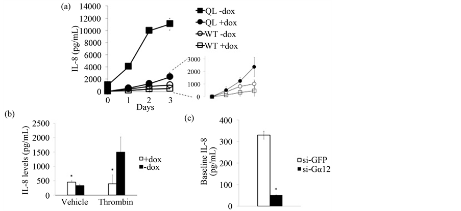 Figure 1. IL-8 is upregulated by Gα12 activation. (a) Time course of increased IL-8 release with expression of both wild-type and constitutively active (QL) Gα12. Gα12 and QLα12-MDCK cells were incubated +/−dox (−dox = Gα12 expression; +dox = control) for 3 days (n = 8 for each set). Supernatants were collected and assayed by ELISA for IL-8 levels; (b) Gα12-MDCK cells −dox showed greater IL-8 production than +dox cells (n = 4) 1 day after thrombin stimulation (P < 0.0118); (c) Baseline IL-8 levels in the si-Gα12 in comparison to the si-GFP MDCK cells (P < 0.0001).