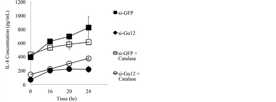 H2O2 is a key ROS mediator of injury and directly activates Gα12 [22] . To determine if H2O2 stimulated Gα12 regulates IL-8 expression, we utilized the well-established ROS model of reversible epithelial injury with H2O2/catalase [22] [24] in si-Gα12 and si-GFP MDCK cells (Figure 2). si-Gα12 and si-GFP MDCK cells were compared +/− catalase at baseline, and at multiple times up to 24 h after exposure to 2.5 mM H2O2 (Figure 2). Control cells (si-GFP) have significantly higher baseline IL-8 expression levels than si-Gα12-cells (0 h in Figure 2) and similar to what is shown in Figure 1(c). At T = 0, cells are exposed to H2O2 +/− catalase and si-GFP cells were more prone to barrier disruption (see [22] ). With H2O2 injury, si-Gα12 MDCK are protected and secrete significantly lower amounts of IL-8 in comparison with controls.