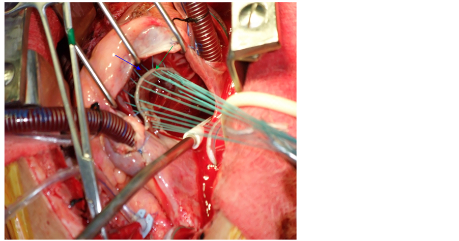 Figure 1. Intraoperative view showing pericardial strip (green arrow) before fixing it to tricuspid annulus (blue arrow).