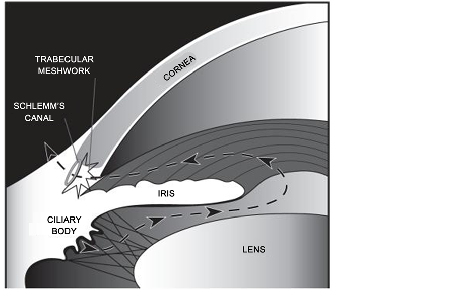 The normal intraocular pressure (range 11 - 21 mmHg) is dependent upon a delicate balance of aqueous humour production, inflow and outflow [17] . Aqueous humour is produced by the ciliary body, and provides nourishment to the avascular cornea and lens (Figure 1). The main drainage pathway for the aqueous from the anterior chamber is the pressure-dependent conventional outflow pathway—through the trabecular meshwork (TM).