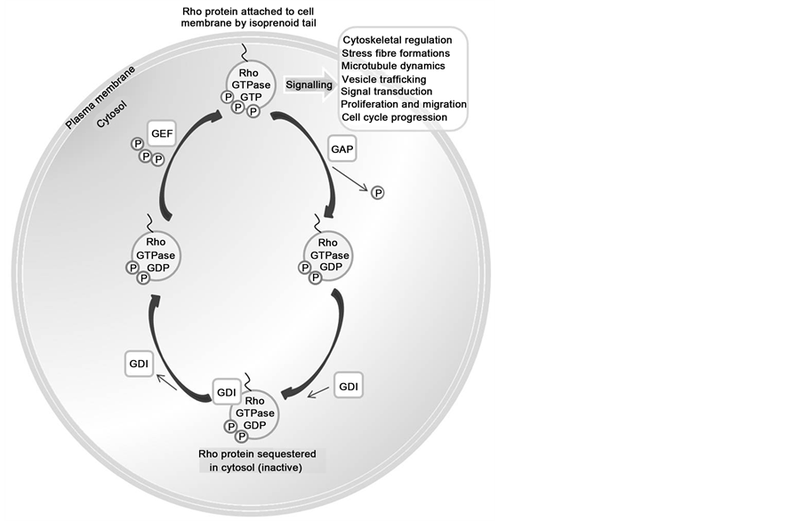 Statins are inhibitors of 3-hydroxy-3-methylglutaryl-coenzyme A (HMG-CoA) reductase—the crucial rate limiting step in hepatic cholesterol biosynthesis. Independently of the cholesterol lowering effect, the inhibition of HMG-CoA leads to reduced synthesis of isoprenoid intermediaries—farnesyl pyrophosphate (FPP) and geranylgeranyl pyrophosphate (GGPP) (Figure 2) [32] . These precursors of cholesterol biosynthesis are essential for post-translational modification and prenylation of certain small GTPase proteins, include the Ras and Rho superfamilies [33] . Prenylation of these proteins facilitates their intracellular trafficking and covalent attachment to the lipid membrane, which is often essential for biological function. These small GTPases cycle between an inactive GDP bound form found in the cytosol in association with guanine dissociation inhibitor (Rho GDI), and an active GTP bound form usually associated with the cell membrane (Figure 3). When Rho proteins are released from GDIs, they can insert into the cell membrane where they are activated by guanine nucleotide exchange factors (GEFs), and this initiates interaction with membrane effector proteins such as Rho kinase (ROCK). The Rho family of proteins is implicated in many key intracellular events and signalling pathways, including regulation of the actin cytoskeleton, cell adhesion, cell to cell interaction, and cell-cycle progression. This topic is comprehensively reviewed by Burridge and colleagues [34] . It is thought that inhibition of the Rho pathway by statins is one of the major mechanisms via which statins affect cell physiology.