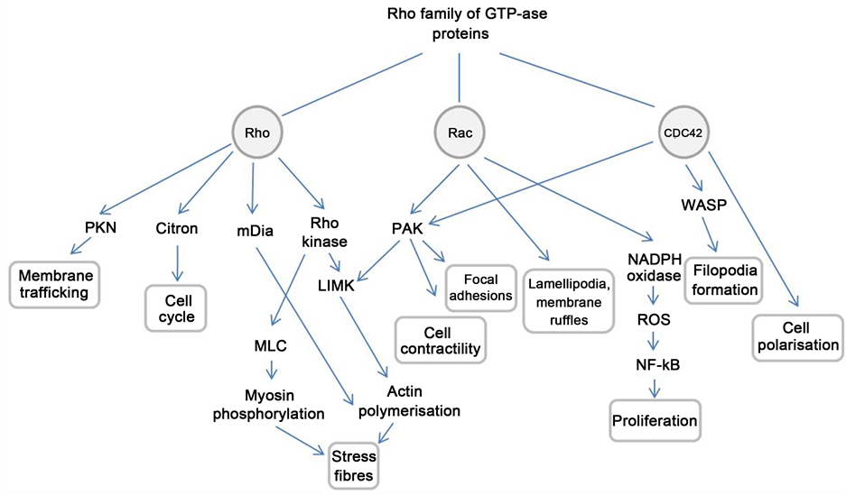 Figure 4. The Rho signalling pathway. PKN: Protein kinase N; mDia: Mammalian diaphanous protein; MLC: Myosin light chain; LIMK: LIM kinase; PAK: p21-activated kinase; NADPH: Nicotinamide adenine dinucleotide phosphate; ROS: Reactive oxygen species; NF-κB: Nuclear factor kappa-light-chain-enhancer of activated B cells; WASP: Wiskott-Aldrich syndrome protein. This diagram illustrates the major effector pathways for the Rho family of proteins (Rho, Rac and CDC-42) which are relevant to glaucoma pathogenesis.