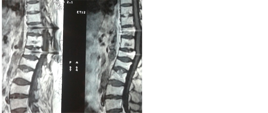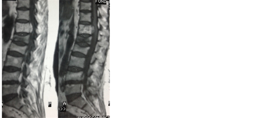 Figure 2. Sagittal thoraco-lumbar spine MRI showed intensity T12 signal T1 and T2, with spine canal extension and L1 benign vertebral fractures.