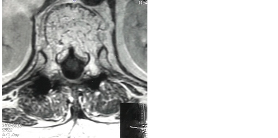 Figure 3. Axial MRI T12 image depicted that the lesion involved the vertebral body and spread into spinal canal.