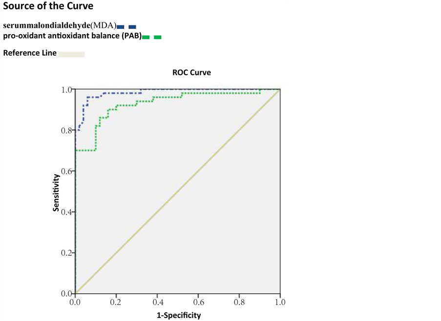 Figure 1. ROC Curve for of pro-oxidant antioxidant balance (PAB) and serum malondialdehyde (MDA) for IBD detection from healthy subject.