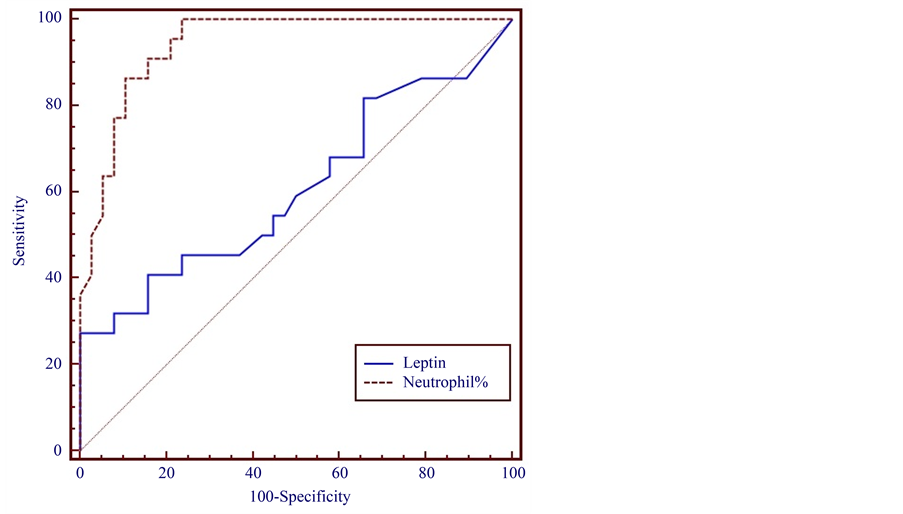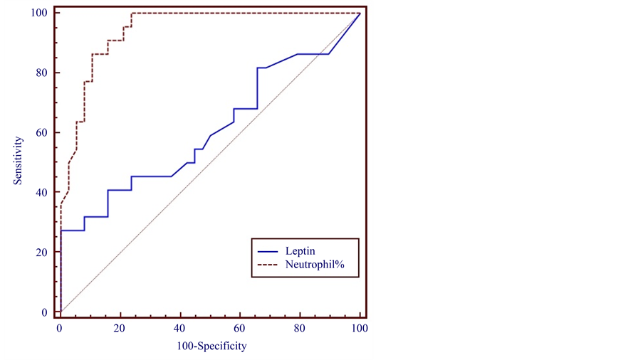 Figure 2. Sensitivity and specificity of preoperative serum leptin levels and neutrophil% for diagnosis of acute appendicitis in children.