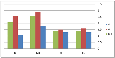 Table 2 and Figure 6 reports the periodontal and radiographic findings where group III showed an increase in PLI, GI, CAL and MBL compared to GI and GII. The mean and ±SD of PLI in group II is more than group I and group III. This is a statistically significant difference (P = 0.005*). The main and ±SD of PLI group II is (1.6 ± 0.6).