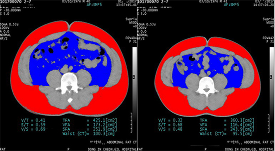 We performed abdominal fat computerized tomography to assess the efficacy of the cryolipolysis procedure after fasting for 8 hours at initial and 8th week. We compared the cross sectional areas of VAT (Visceral Adipose Tissue) and SAT (Subcutaneous Adipose Tissue) in cm2 using by abdominal computerized tomography (Spuria, Hitachi, Japan, 2016) at umbilicus level, and obtained FPG (Fasting plasma glucose), total cholesterol, and HDL-cholesterol, TG (Triglyceride), and Aspartate Transaminase (AST), Alanine Transaminase (ALT) after fasting for 8 hours at initial and 8th week.