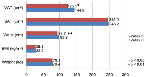 The demographic variables, waist circumferences and the cross sectional areas of adipose tissue described at baseline and 8th week. Their waist circumferences significantly decreased by 4.1 ± 6.3 cm (P = 0.023), however both of weight and BMI increased by 0.1 ± 1.2 kg (P = 0.777), 1.9 ± 0.6 kg/m2 (P = 0.528) (Table 1).
