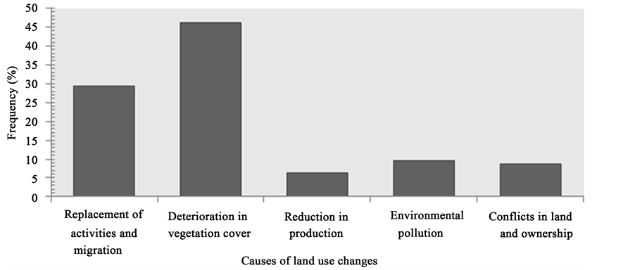 The land use changes affecting people lives are: vegetation, forest cover, and causes of land degradation according to the respondents as shown in (Figure 2). Most of respondents (46.3%) asserted that change in land use has led to deterioration in vegetation cover as a consequence of illegal felling, overgrazing and conversion of forest land to other uses, 29.2% of the respondents mentioned that the changes led to replacement of activities and migration of local people to other land uses, 9.6% of the respondents mentioned environmental pollution which has been caused by the bricks kilns, the relative industrial expansion, 8.7% of them believed that the change in land use practice is behind the conflicts while 6.2% of the respondents believe that this change has resulted in reduction in production (Figure 2).