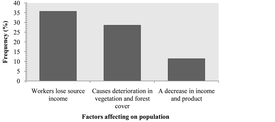 The factors responsible for the deterioration of forest and tree cover in the study area, according to the respondents, are shown in Table 2. The status of the forest was described into two factors: deteriorated and constant/ improving. 86.4% of the respondents asserted that the current status of the forest is degraded, while 13.7% described the status as constant or improving (Table 2). Different human activities and interferences such as over- cutting, overgrazing, expansion in agriculture and buildings were mentioned by 65.28% of the respondents as the main factor behind the deterioration of the vegetation and tree cover, while natural factors were mentioned by 23.18%. Respondents were able to nominate different reasons responsible for the change land use and these reasons affect forest cover and people’s life in the study area. Most of respondents believe that the land use change is due to Government’s use of its lands for settlement and investments buildings and that these changes affect vegetation cover and population livelihoods, as the population has increased in the last years, while some of them believe these changes are because of local people illegally cutting trees thereby converting forest lands to other uses. This result is consistent with Ghenaim [6] . Khaleel [5] has mentioned the human and natural factors for changes in land use and reported that these factors have great negative impacts in the vegetation cover in some locations of Sudan. While the constant or improving factor was mentioned by only 7.45% of the respondents who attributed this to the effect of awareness and legislation, 4.0% of the respondents reported that this is due to the fact that reliance on forest was weak and that this includes the degree of dependence on the vulnerable forest, grazing is not a forest activity, environmental awareness, extension, continued administration and regulation cutting rotation (Table 2).