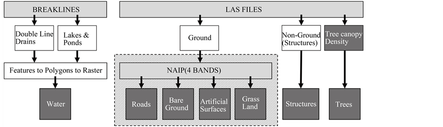 Ground only data were also extracted in the same process, by excluding the structures as well as trees, and used as a constraining mask for the classification of the NAIP multispectral aerial photo. Which produced 4 additional classes, namely: roads and pavement (mainly asphalt-covered surfaces), bare ground (tilled fields, gravel and dirt covered roads, and any surface with no vegetation cover), artificial surfaces (turf that is typically found in stadiums, open tennis courts, etc.), and grassland (open vegetation, shrubs and non-tree covered areas). Finally, the lakes and ponds breaklines were extracted, converted to polygons (area features), and rasterized. All produced classes were then merged into one raster layer. In the following section the detailed description of the ground only classification using the NAIP multispectral aerial photos is presented.