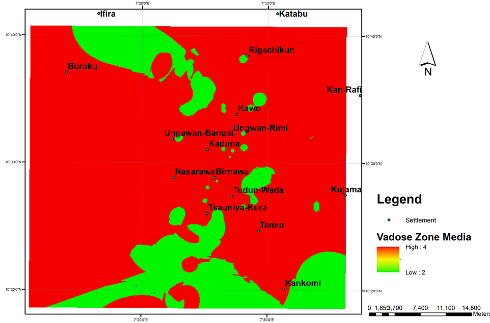 was also adjusted to 2 and 3 for massive igneous around Malali and partially weathered formation around Malali, Unguwan Rimi and the like. Using the same software, the vadose zone map of the area was produced (Figure 7).