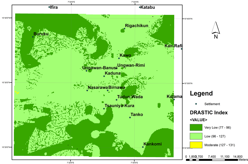 From the classified DRASTIC vulnerability map, one can rightly see that, majority of the study area falls within very low, low and moderate vulnerability to groundwater contamination. Very low vulnerability areas can be seen in the northern part around Turunku and Sabon Gida, in the northeast around Rinagi,