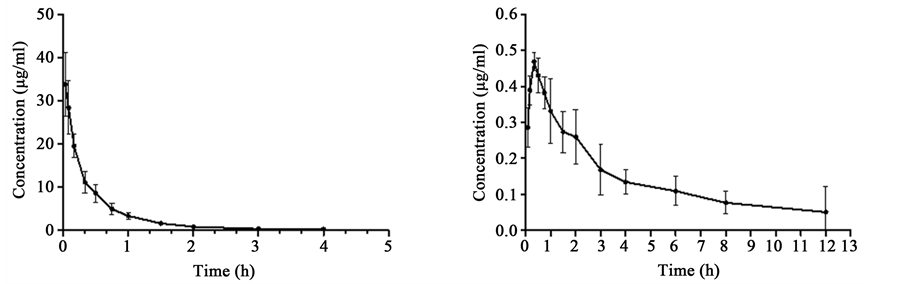 Figure 4. (a) Mean plasma concentration time profile after intravenous (10 mg/kg) administration of poliumoside in rats; (b) Mean plasma concentration time profile after oral (200 mg/kg) administration of poliumoside.