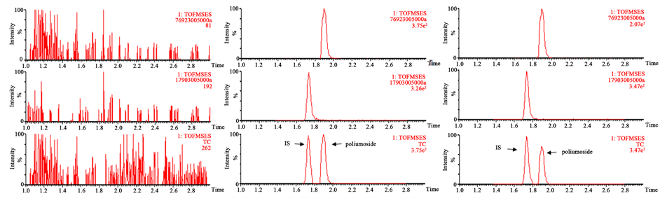 To separate the interfering compounds from the poliumoside and IS, different columns and mobile phase compositions were compared for chromatographic separation. The Waters BEH C18 column showed better peak shape and appropriate retention time for the analyte than Phenomenex Kinetex C18 column (2.1 × 50 mm, 2.6 μm). Appropriate ionization and chromatographic behavior were based on the proper mobile phase [14] - [16] . The gradient mobile phase with water (containing 0.1% formic acid) and acetonitrile greatly shortened the retention time of the analyte. The gradient was verified to be stable and repeatable according to the following test of method validations. The addition of 0.1% formic acid in water and acetonitrile could improve peak shapes under the optimized conditions. The retention time of IS and poliumoside were 1.91 min and 1.73 min for pharmacokinetic study, respectively.