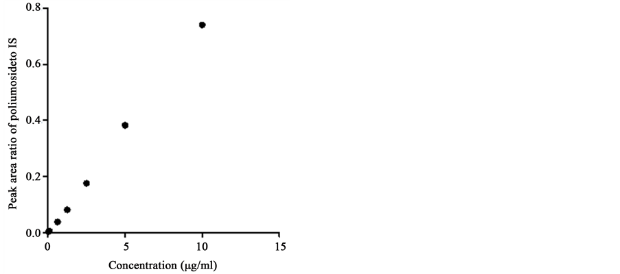 To construct the calibration curve, the spiked calibration samples in gradient were analyzed in three consecutive days. Peak area ratios of poliumoside to IS were plotted against analyte concentrations and the date was well fitted by least-square regression using 1/x2 as the weighting factor in the concentration range of 50 - 10,000 ng/mL.