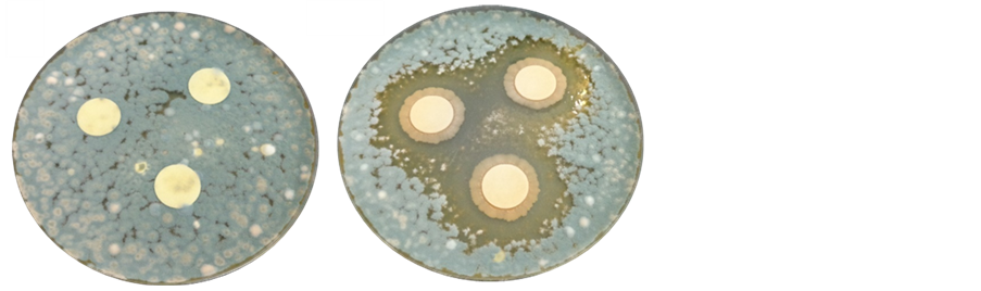 Figure 1.Antifungal activity of biocides against Penicillium sp. using paper disk diffusion assay. (a) Control; (b) In the presence of Bacillus sp. CCMI 1053 cell free culture Broth.
