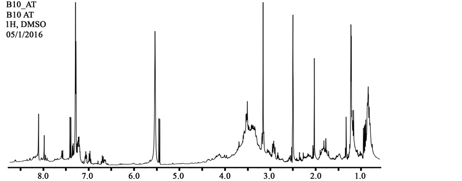 The 1H-NMR spectrum of the bioactive compounds showed signals for N-binding protons at δ 6.8 - 8.6 ppm, α-protons at δ 4.0 - 4.5 ppm and β/γ-protons at δ 1.4 - 4.0 ppm of peptide bonds (Figure 2). Additionally we can observe multiple sets of A2B2 coupling pattern protons of benzene rings at δ 6.6 - 7.1 ppm (each d, J ~ 8.0 Hz), methylene protons of long aliphatic chains at δ 1.0 - 1.3 ppm and terminal methyl protons at δ 0.7 - 1.0 ppm. These patterns of signals are consistent with the presence, almost exclusive, of lipopeptides, compounds made of amino acids and a fatty acid chain [14] [23] - [25] .
